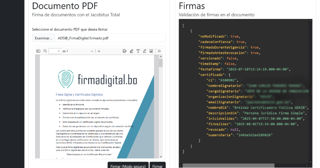 Esta solución es ligera, extensible y compatible con distintas tecnologías modernas. Cuenta con ejemplos de uso disponibles para vanillaJS, Vue.js y Next.js, lo que facilita su adopción en diversos proyectos web institucionales o corporativos que requieren funciones de firma digital desde el navegador.