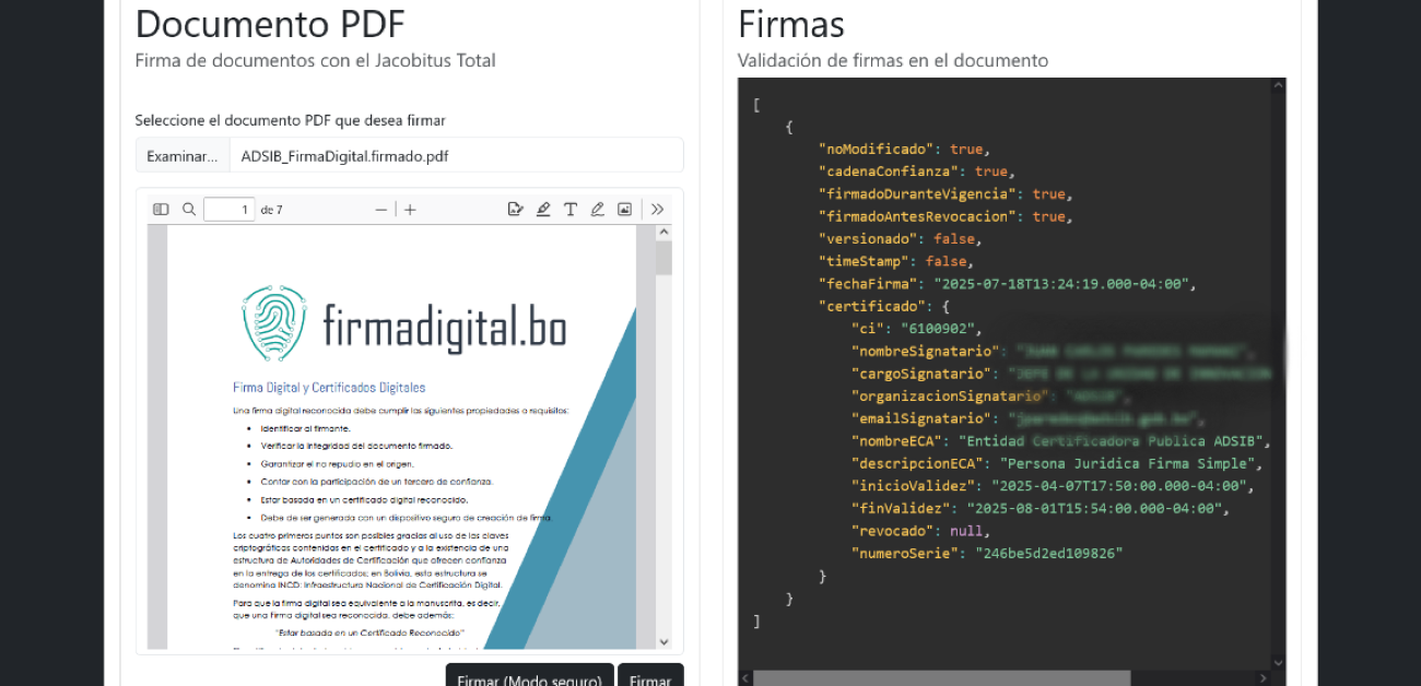 Esta solución es ligera, extensible y compatible con distintas tecnologías modernas. Cuenta con ejemplos de uso disponibles para angular, lo que facilita su adopción en diversos proyectos web institucionales o corporativos que requieren funciones de firma digital desde el navegador.